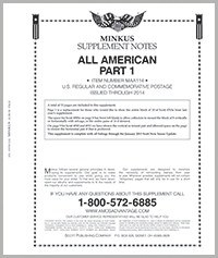 Loading... Please wait...One fresh from the publisher Minkus 2000 All-American Supplement, Part 1. This supplement contains 35 pages and has space for US Regular and Commemorative issues released during 2000. Minkus All-American binders are available and sold seperately. This is a special order item. Questions about special orders? Just ask! Contact us at specialorders@nolastampshop.com. International Customers: Because of the various shipping options available to save you money, we ask that you please contact us at shippingquestions@nolastampshop.com before placing your order so we can prepare an accurate shipping quote for you.
