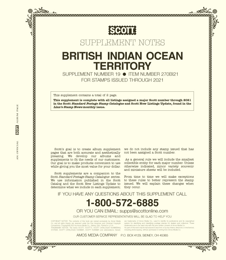 Loading... Please wait...Scott Specialty Series Album Pages: British Indian Territory Supplement 2025 No. 21. This supplement includes spaces for all stamps issued through 2025