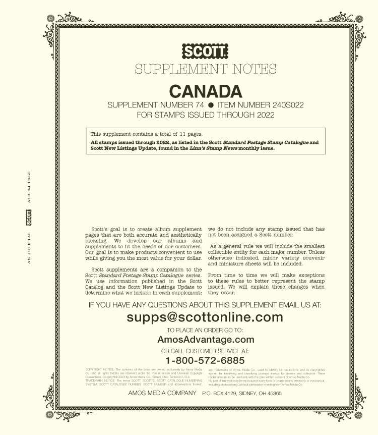 Scott Specialty Series Album Pages: Canada Supplement 2025 No. 76. This supplement contains 11 pages and includes spaces for all stamps issued through all of 2025, as listed in the Scott Catalogue, unless otherwise noted. This is a special order item. Questions about special orders? Just ask! Contact us at specialorders@nolastampshop.com.