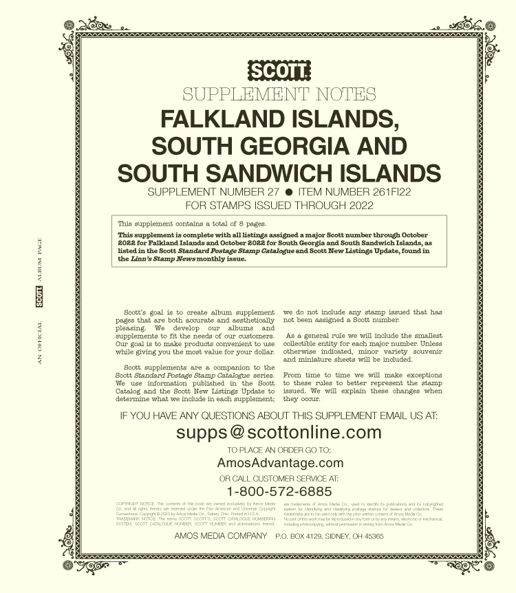 Loading... Please wait...Scott Specialty Series Album Pages: Falkland Islands and South Georgia Supplement 2024, No. 28. This supplement contains spaces for stamps issued in 2024 for the Falkland Islands, South Georgia and South Sandwich Islands, as listed in the Scott Catalogue, unless otherwise noted. These pages can be housed in a Scott Specialty binder and slipcase; a matching binder label also is available. This a special order item. Questions about special orders? Just ask! Contact us at specialorders@nolastampshop.com.