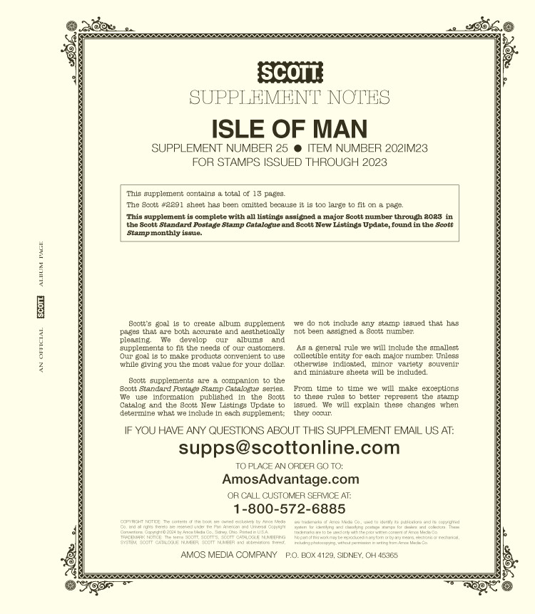 Loading... Please wait...Scott Specialty Series Album Pages: Isle of Man Supplement 2024, No. 26. This supplement includes spaces for all major stamps issues released during 2024, as listed in the Scott Catalogue, unless otherwise noted. These pages can be housed in a Scott Specialty binder and slipcase. A matching label also is available. This a special order item. Questions about special orders? Just ask! Contact us at specialorders@nolastampshop.com.