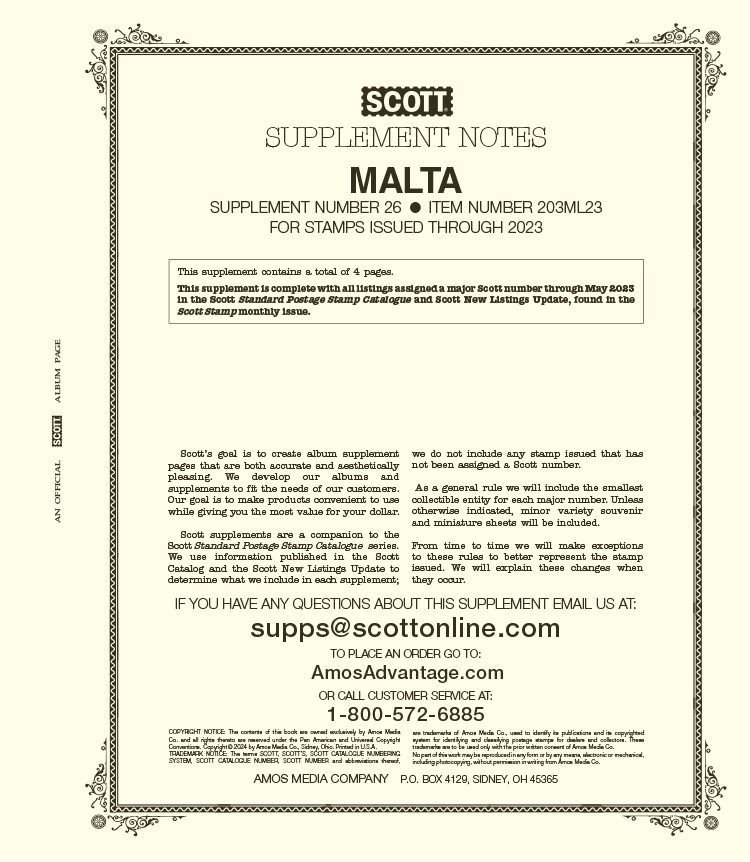 Loading... Please wait...Scott Specialty Series Album Pages: Malta Supplement 2025, No. 27. This album supplement includes spaces for all stamps issued in 2025, as listed in the Scott Catalogue, unless otherwise noted. The pages can be housed in a Scott Specialty binder and slipcase; a matching binder label also is available. This a special order item. Questions about special orders? Just ask! Contact us at specialorders@nolastampshop.com.