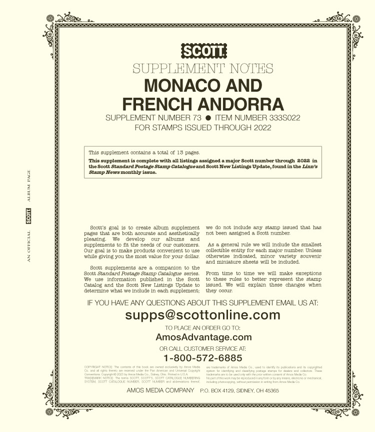 Loading... Please wait...Scott Specialty Series Album Pages: Monaco & French AndorraSupplement 2023, No. 74. This supplement includes spaces for all major stamp issues released through 2023 for Monaco and French Andorra, as listed in the Scott Catalogue, unless otherwise noted. These pages can be housed in a Scott Specialty binder and slipcase; a matching binder label also is available. This a special order item. Questions about special orders? Just ask! Contact us at specialorders@nolastampshop.com.