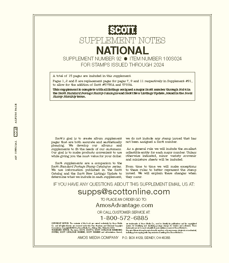 This listing is for one new, fresh from the publisher Scott US National 2025 Supplement No. 93. This supplement contains spaces for stamps issued through December 2025, as listed in the Scott Standard Postage Stamp Catalogue.
