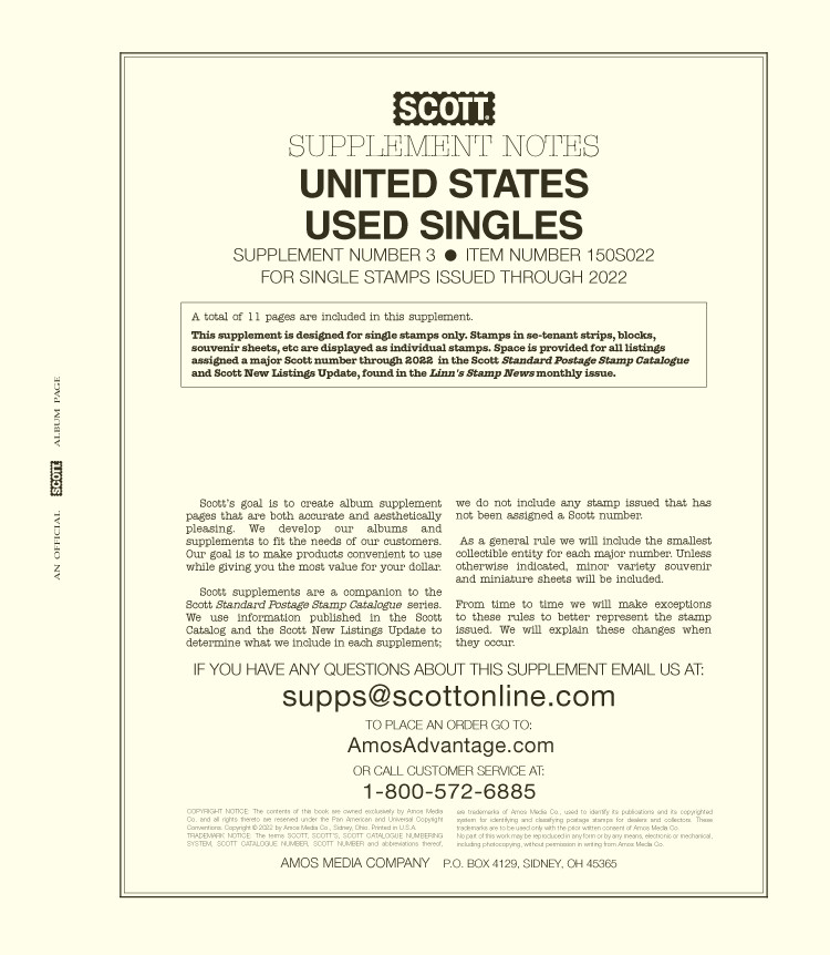 This listing is for one new, fresh from the publisher Scott US National Used Singles 2022 Supplement No. 3. This supplement contains 8 is complete with spaces for single stamps issued through December 20212 as listed in the Scott Standard Postage Stamp Catalogue, unless otherwise noted.