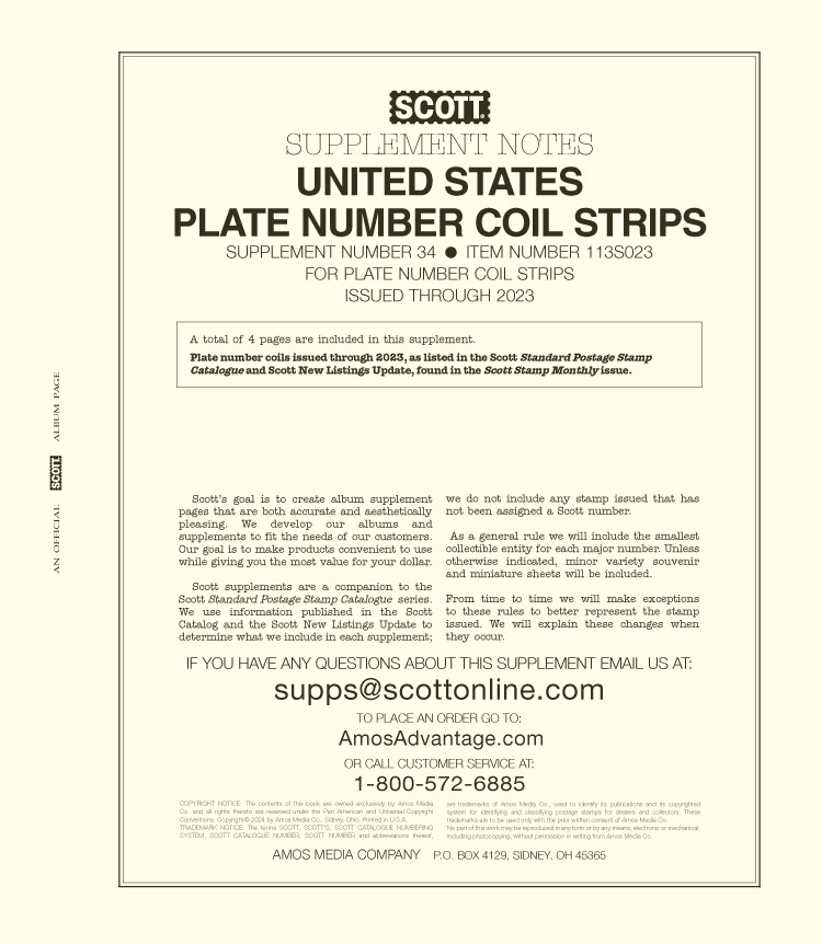 One new, fresh from the publisher Scott 2023 U.S. Plate Number Coils - Simplified, No. 34 album supplement. This supplement contains spaces for all plate number coils issued through 2023, as listed in the Scott U.S. Specialized Catalogue, This is a special order item. Questions about special orders? Just ask! Contact us at specialorders@nolastampshop.com.
