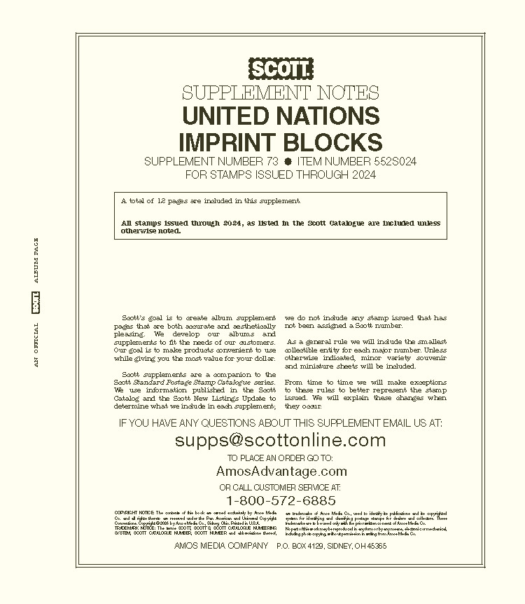 Scott United Nations National Supplement 2024, No. 73 . This supplement contains 12 pages and includes spaces for all stamps issued through 2024, as listed in the Scott Catalogue, unless otherwise noted. This is a special order item. Questions about special orders? Just ask! Contact us at specialorders@nolastampshop.com.