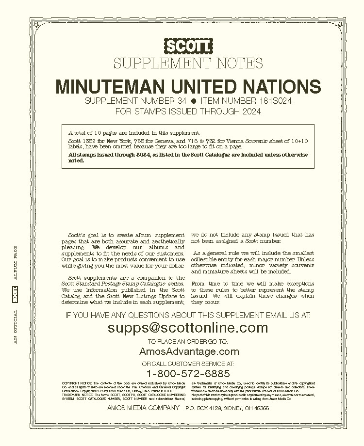 Scott United Nations Minuteman Supplement 2024 No. 56. This supplement includes spaces for all stamps issued throughout 2025, as listed in the Scott Catalogue, unless otherwise noted. This is a special order item. Questions about special orders? Just ask! Contact us at specialorders@nolastampshop.com.